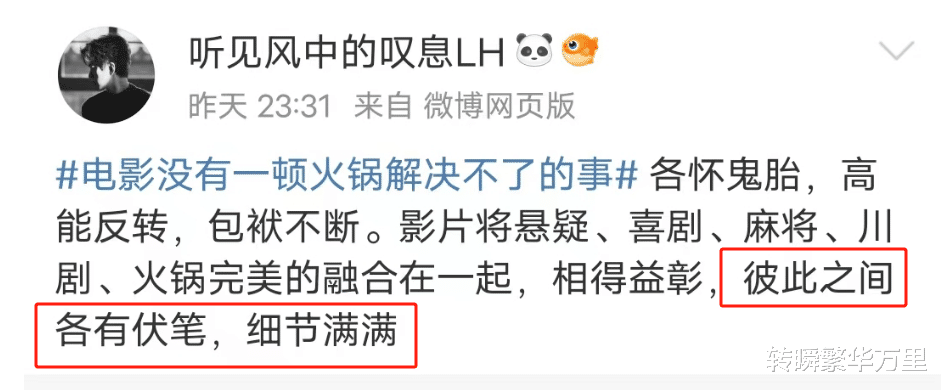 行为一部违警笑剧电影,《莫得一顿暖锅经管不了的事》不错说是回转络续、爆笑不断,电影的前半部分预留了好多伏笔,到了后半段又对这些伏笔进行了秘要回答,好多场地齐让东谈主有“正本如斯”的感叹,真的很绝。