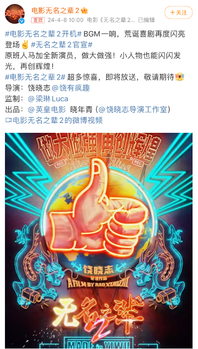 4月8日,电影《无名之辈2》官宣开机。电影官微发文:“原班东谈主马加全新演员,作念大作念强!凡人物也能闪闪发光,再创色泽!”