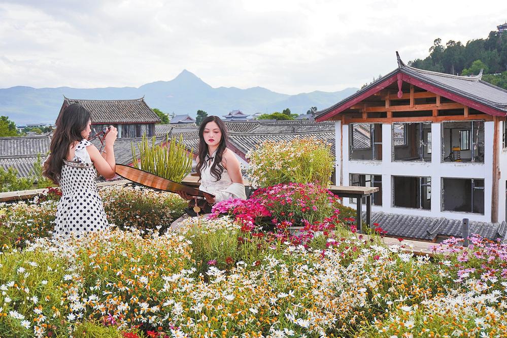 搭客在丽江古城东说念主皮客栈屋顶拍照。 本报记者 李铁成 摄