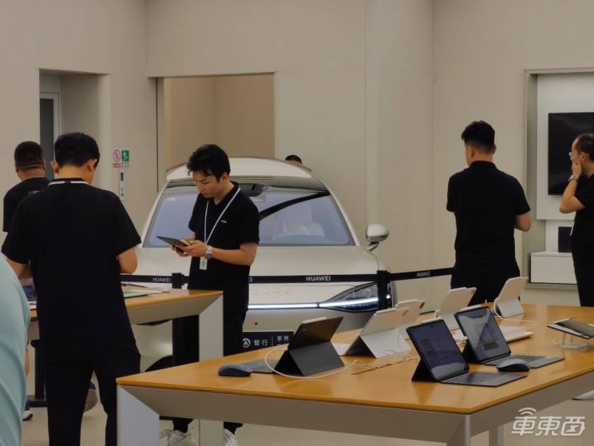 有带小孩的一家四口看完智界S7,回身又看享界S9。还有订购华为手机的一双30岁傍边的佳偶,也前来了解这款车,上车体验时期也在十分钟以内。