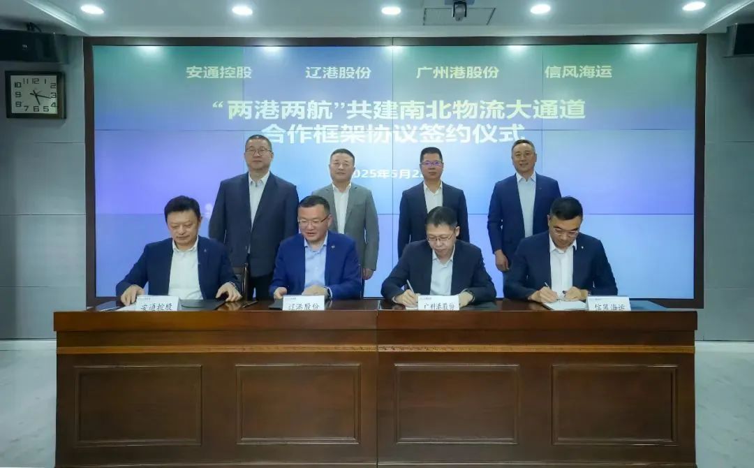 日前,安通控股股份有限公司(简称安通控股)与辽宁口岸股份有限公司(简称辽港股份)、广州港股份有限公司(简称广州港股份)、信风(宁波)海运物流有限公司(简称信风海运),在大连认真签署《“两港两航”共建南北物流大通谈调和框架公约》。