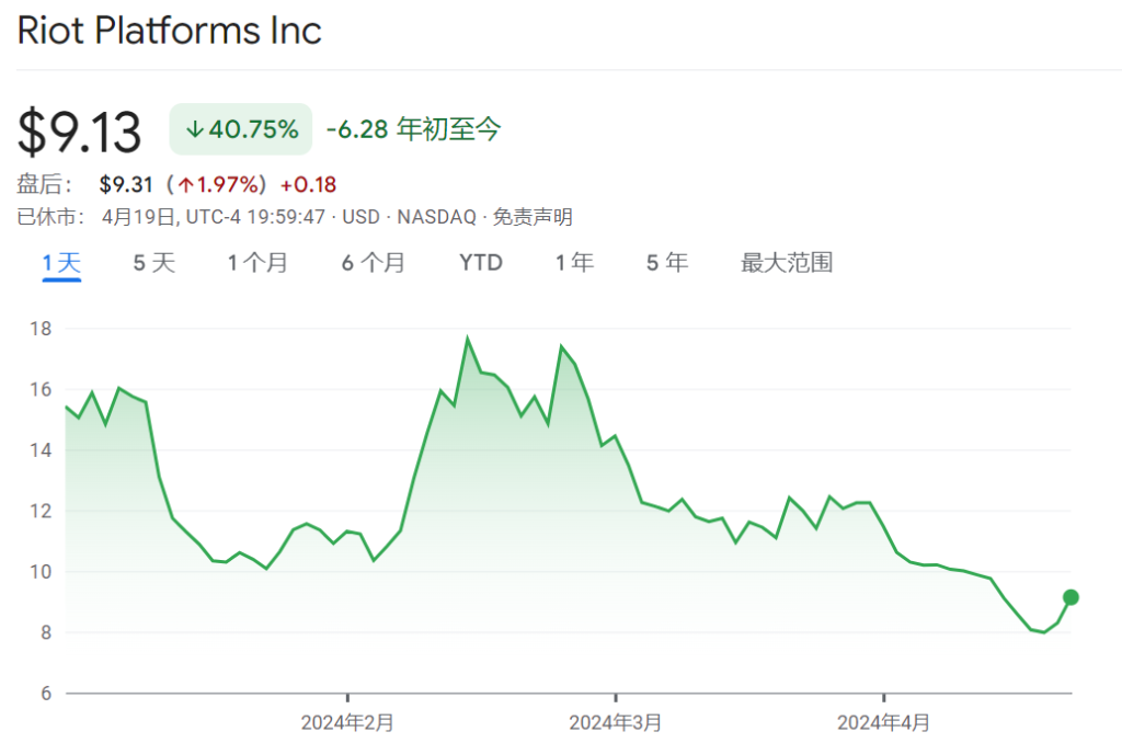减半前夜,比特币矿商走势跌宕,比如Riot Platforms周五收盘下落约41%,但2023年曾暴涨356%。本年以来,比特币大批矿商股价跌幅达两位数,这与2023年300%至600%的涨幅酿成赫然对比。