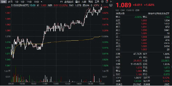 端午假期“科特估”见识发酵,本日半导体、电子元件等科技股领涨两市,代表A股科技龙头行情的科技ETF(515000)全天漂泊走高,场内价钱尾盘高涨1.02%收于日内高点,全天成交额超5100万元。