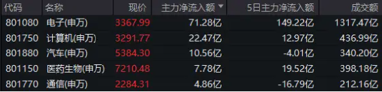 资金方面,本日主力猛攻科技赛谈,单日净流入金额超百亿元。Wind数据披露,本日电子、诡计机、医药生物、通讯分歧获主力资金净流入71.28亿元、22.47亿元、7.78亿元、4.86亿元,分歧居31个申万一级行业净流入榜第一、第二、第四、第五。