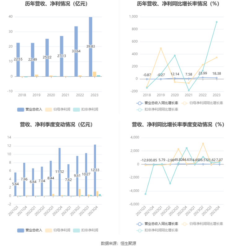 中证智能财讯万安科技(002590)4月17日暴露2023年年报。2023年,公司已毕贸易总收入39.83亿元,同比增长18.38%;归母净利润3.20亿元,同比增长346.08%;扣非净利润8361.01万元,同比增长917.00%;筹画活动产生的现款流量净额为2.70亿元,同比增长271.84%;敷陈期内,万安科技基本每股收益为0.67元,加权平均净财富收益率为15.14%。