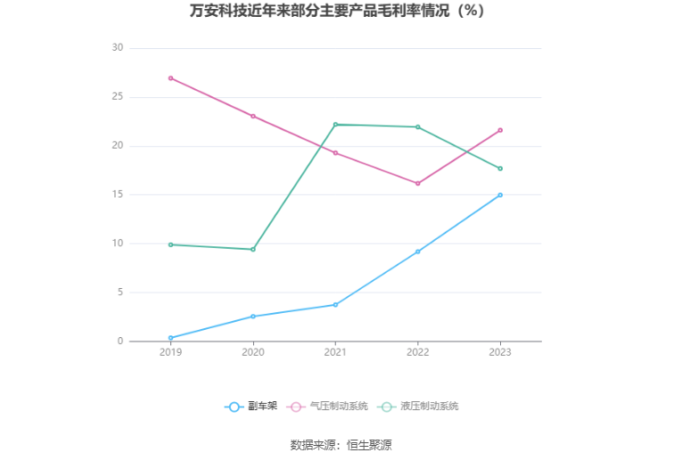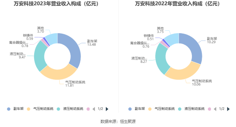 分居品看,副车架、气压制动系统、液压制动系统2023年毛利率分辨为14.98%、21.60%、17.68%。