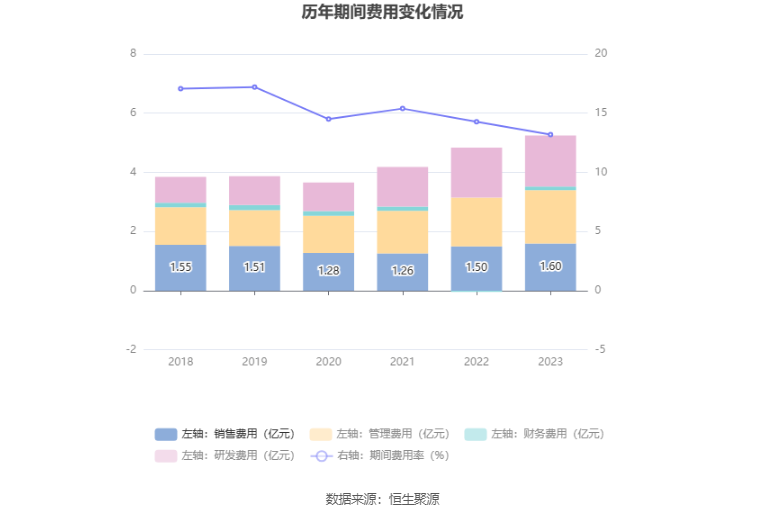 2023年,公司时间用度为5.26亿元,较上年同时增多4538.48万元;但时间用度率为13.20%,较上年同时下落1.08个百分点。其中,销售用度同比增长6.8%,管制用度同比增长8.99%,研发用度同比增长2.35%,财务用度由客岁同时的-406.86万元变为1228.80万元。