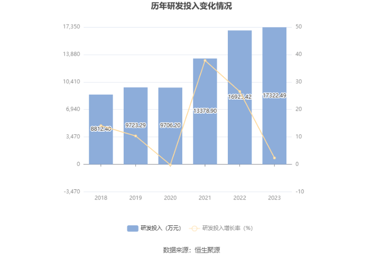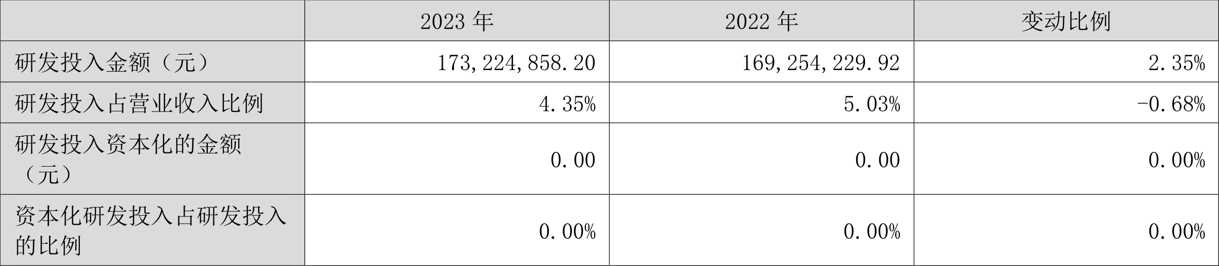 2023年全年,公司研发参预金额为1.73亿元,同比增长2.35%;研发参预占贸易收入比例为4.35%,比较上年同时下落0.68个百分点。此外,公司全年研发参预老本化率为0。