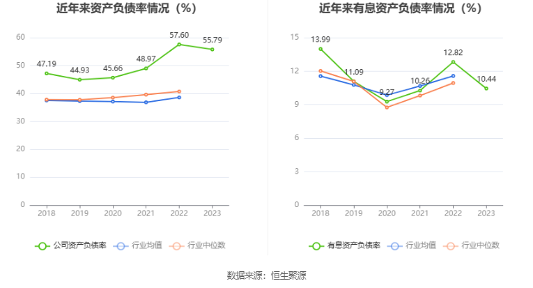 在偿债智商方面,公司2023年年末财富欠债率为55.79%,比较上年末下落1.81个百分点;有息财富欠债率为10.44%,比较上年末下落2.38个百分点。