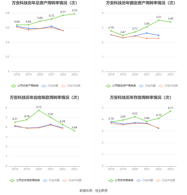 营运智商方面,2023年,公司公司总财富盘活率为0.79次,上年同时为0.77次(2022年行业平均值为0.56次,公司位居同业业18/98);固定财富盘活率为3.40次,上年同时为3.51次(2022年行业平均值为2.48次,公司位居同业业29/98);公司应收账款盘活率、存货盘活率分辨为3.64次、4.71次。