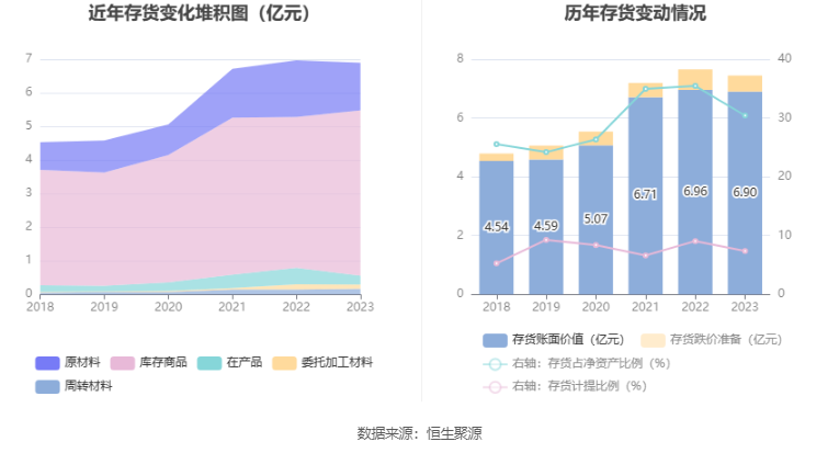 从存货变动来看,限制2023年年末,公司存货账面价值为6.9亿元,占净财富的30.43%,较上年末减少603.31万元。其中,存货跌价准备为5503.45万元,计提比例为7.39%。