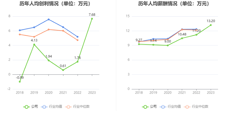 限制2023年末,公司职工总额为4163东说念主,东说念主均创收95.66万元,东说念主均创利7.68万元,东说念主均薪酬13.20万元,较上年同时刻别增长15.80%、336.32%、17.84%。