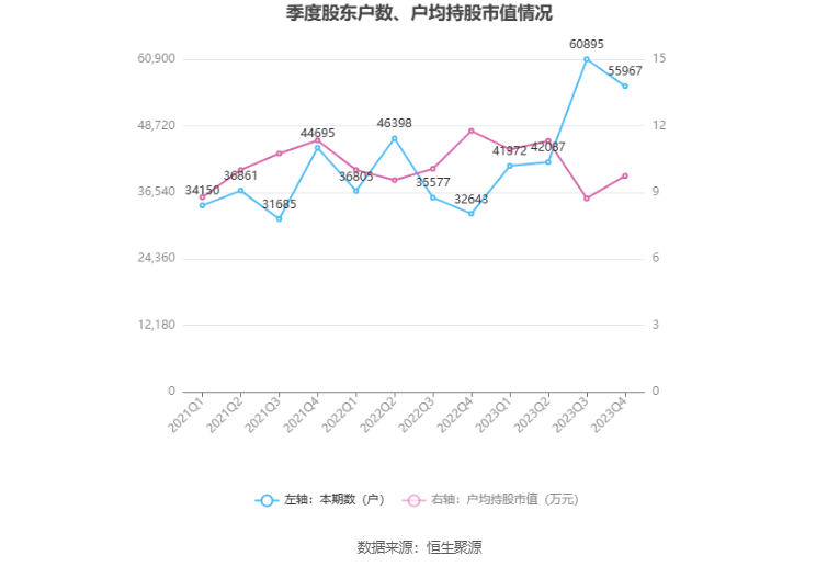 筹码网络度方面,限制2023年年末,公司股东总户数为5.6万户,较三季度末下落了4928户,降幅8.09%;户均捏股市值由三季度末的8.73万元上涨至9.74万元,增幅为11.57%。