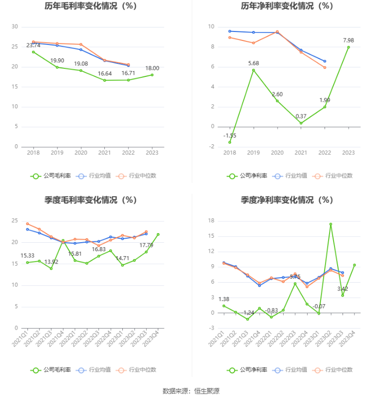 2023年,公司毛利率为18.00%,同比上涨1.29个百分点;净利率为7.98%,较上年同时上涨5.99个百分点。从单季度见识来看,2023年第四季度公司毛利率为21.89%,同比上涨3.80个百分点,环比上涨4.10个百分点;净利率为9.39%,较上年同时上涨7.66个百分点,较上一季度上涨5.97个百分点。