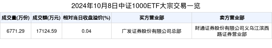 2024年10月8日,中证1000ETF(512100.SH)收涨5.86%,发生1笔溢价大批往返,成交价为2.53元,较当日收盘价溢价0.04%。成交额为1.71亿元,居全阛阓首位。