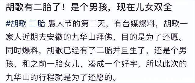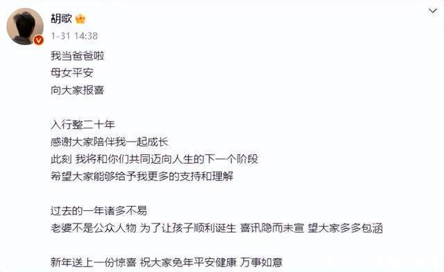 前不久,在收集上传说,胡歌二胎犬子出身了。不外,佳耦俩于今还莫得回话。