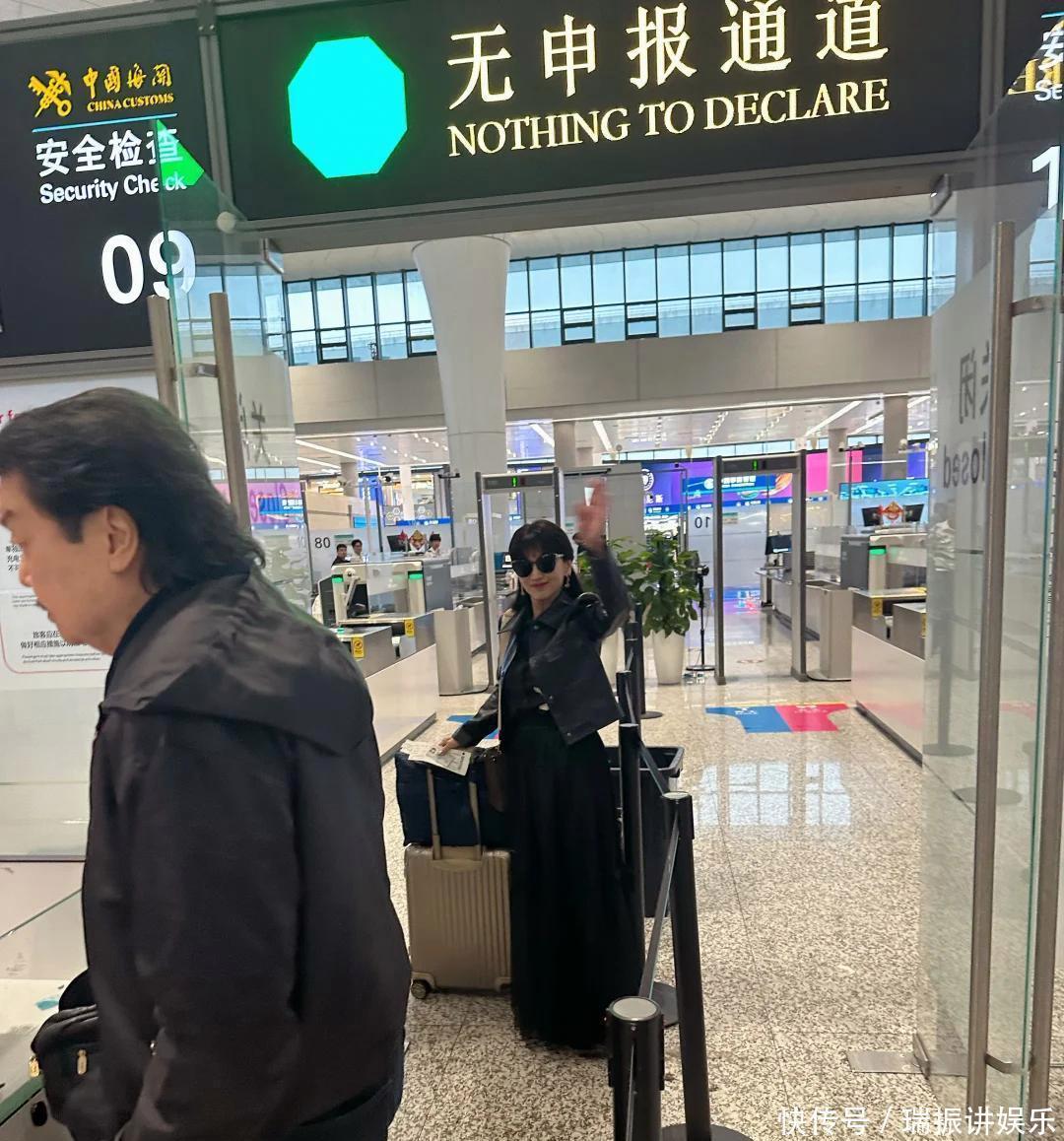 再看赵雅芝,她半扎着头发,墨镜遮脸,LV包包看着就不轻,还拖了一个大箱子。