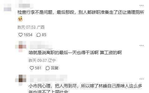 一部分网友纷繁留言为保姆抱不服,他们认为张馨月作念得太过分了。有东谈主就说:“保姆不是随从,保姆仍是作念完责任了,还要稽查行李两次,这是什么兴趣兴趣?不投诚东谈主家?别东谈主走了看皆不看一眼,没功劳也有苦劳吧。”还有东谈主吐槽说:“化妆有什么用,实质等于一个尖嘴薄舌的东谈主,林峯是什么目光啊,他前任吴千语光是情商就远胜她几百倍。”不外呢,也有网友握有不同的不雅点,他们指出保姆走之前稽查行李是应该的。就像有些网友说的:“请过大姨的皆知谈,大姨要走的临了一天皆要稽查行李,何况是明星家,行动有处事修养的大姨,应该主动问老板是否稽查行李;明星家可贵物品太多了,稽查下没啥吧;大姨皆会主动给稽查箱子,对两边皆好。”