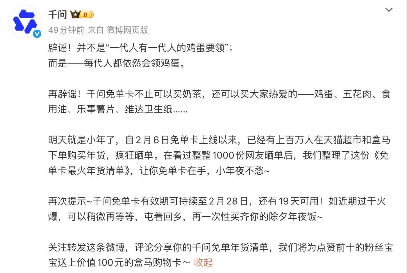 凤凰网科技讯 2月9日,千问官方发文称,并不是“一代东说念主有一代东说念主的鸡蛋治安”;而是每代东说念主齐依然会领鸡蛋。并称免单卡不啻不错买奶茶,还不错买大家喜爱的鸡蛋、五花肉、食用油、乐事薯片、维达卫生纸等等。