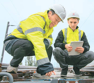 在塞尔维亚诺维萨德的匈塞铁路塞尔维亚段技俩部营地,中国职工段伟(左)与外籍职工全部检查轨谈施工情况。